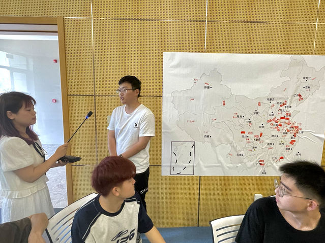 紧接着,每位同学将自己制作的姓名印章蘸上红彤彤的印泥,印到自己所属省份的中国地图墙上。大家接力篆印,地图上的姓名渐渐从无到有,积微成著,正如中国工农红军创建革命根据地时的铢积寸累,新时代青春学子的力量接续红色革命血脉,最终星星之火,成为了燎原之势。
